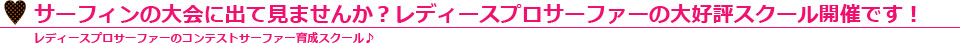 初めてサーフコンテストになんて緊張しますよね。まずはそんな不安を取り除くためにスクールを受講してみてはいかがですか? 指導してくれる先生は、みんなレディースプロサーファー。女の子同志だからいろいろ聞いて、楽しくスクール受けちゃいましょう。もちろん中級者以上のレベルアップスクールも同時開催。 大会までに何をすればよいのか?練習方法や今のあなたのレベルをプロからチェック受けるチャンス!壁にぶつかっているあなたにオススメですよ。